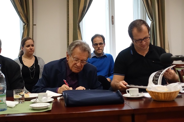 Zľava Daria Fojtíková-Fehérová (DÚ), Vladimír Predmerský, Karol Mišovic (DÚ), Martin Timko (DÚ, prezerá knihu o MCHT).